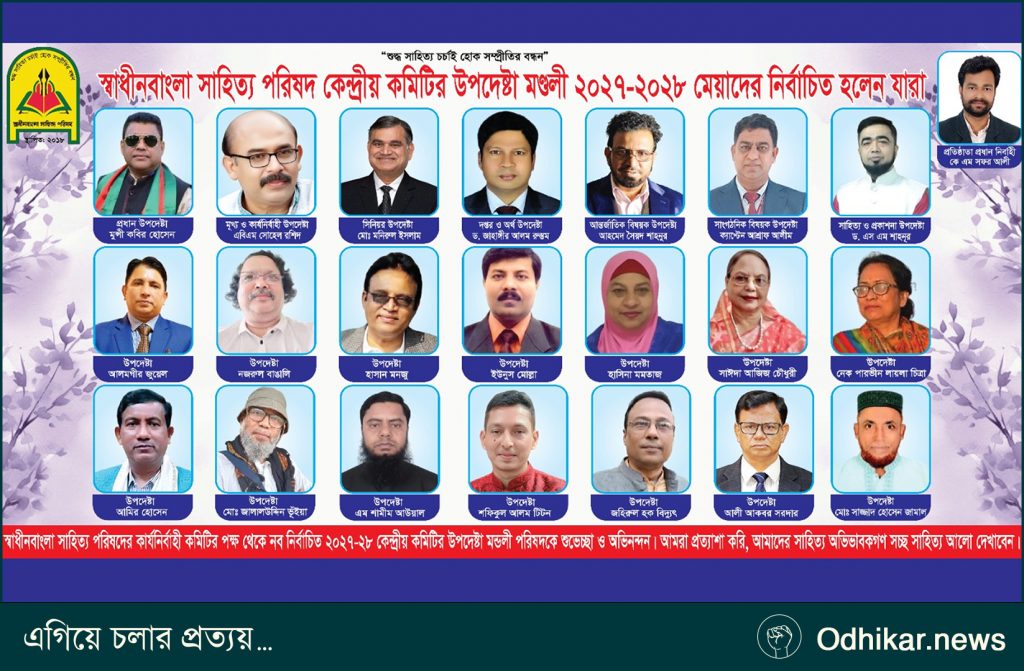 স্বাধীনবাংলা সাহিত্য পরিষদের কেন্দ্রীয় কমিটির ২০২৭–২০২৮ মেয়াদের জন্য দুই বছর মেয়াদি নতুন উপদেষ্টা মণ্ডলী ঘোষণা করা হয়েছে। সংগঠন সূত্রে জানা গেছে, নবগঠিত এই উপদেষ্টা কমিটিতে দেশের বিভিন্ন অঙ্গনের বিশিষ্ট ব্যক্তিদের অন্তর্ভুক্ত করা হয়েছে, যা সংগঠনের কার্যক্রমকে আরও সমৃদ্ধ করবে বলে প্রত্যাশা করা হচ্ছে।