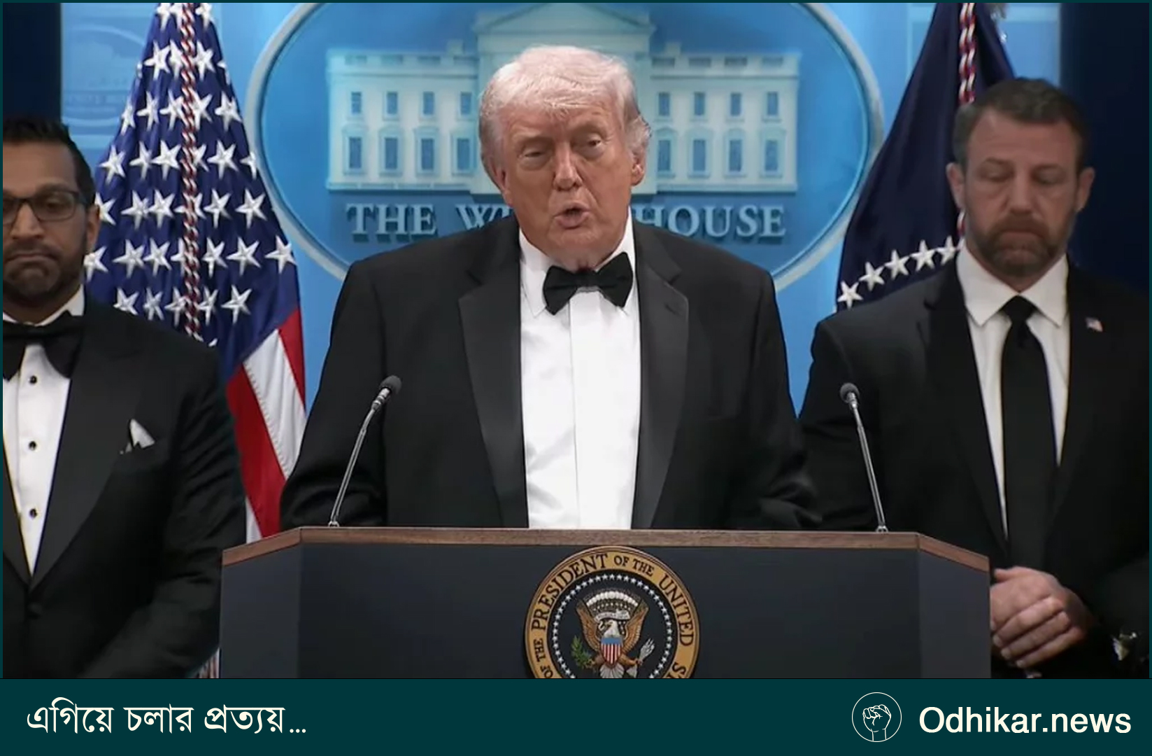 তিনি আরও জানান, এ ঘটনায় এক নিরাপত্তা কর্মকর্তা গুলিবিদ্ধ হন, তবে বুলেটপ্রুফ জ্যাকেট পরিহিত থাকায় তিনি প্রাণে বেঁচে যান। ট্রাম্প বলেন, “আজ রাতে যা ঘটেছে আমরা তা গভীরভাবে খতিয়ে দেখছি। আমি বলব, এই ভবন পুরোপুরি নিরাপদ নয়।”